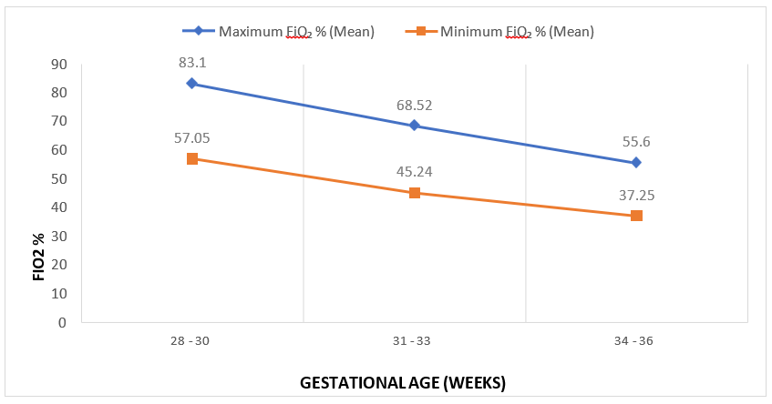 The graph illustrates the mean maximum and minimum fraction of inspired oxygen (FiO₂) across different gestational age groups (28–30, 31–33, and 34–36 weeks). Both maximum and minimum FiO₂ levels decrease with increasing gestational age, reflecting improved respiratory maturity. The Kruskal–Wallis test was applied to compare FiO₂ values among the groups.