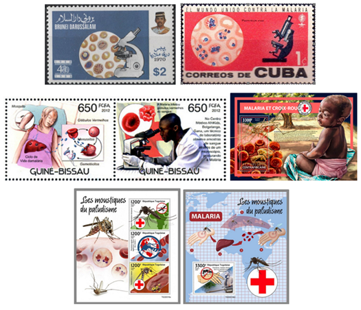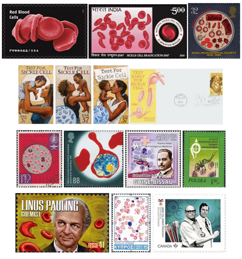 Figure 2. Blood cells, in normal conditions and in a number of different pathological conditions, as reflected in philatelic means.