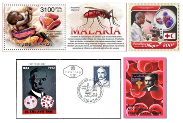 I would like to present my presentation of the text and illustrative material obtained during this study, with materials dedicated to various cells, both "white" and "red" blood, as reflected in such collecting tools as philately - postage stamps and envelopes of different countries of the world and the years of their issue [6-14], and in the means of phaleristics, on thematic badges. Most often, philately presents images of both physiological samples of blood cells, on its smears, and samples of blood cells in various variants of its pathology, most often - in malaria, together with plasmodia of malarial or other infection, as well as in such a pathology as sickle cell anemia. Thematic Figure 2 presents these samples of similar philatelic materials, as well as a representation of bone marrow cells [6-14].