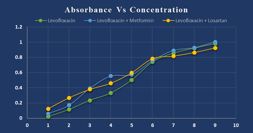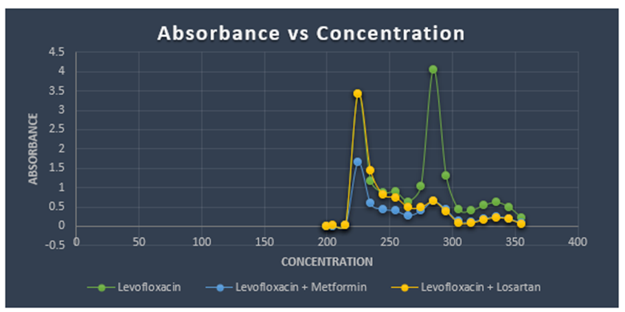 The above figure shows that the absorbance of Levofloxacin differs from the absorbance of Levofloxacin + Metformin and Levofloxacin + Losartan due to interaction.