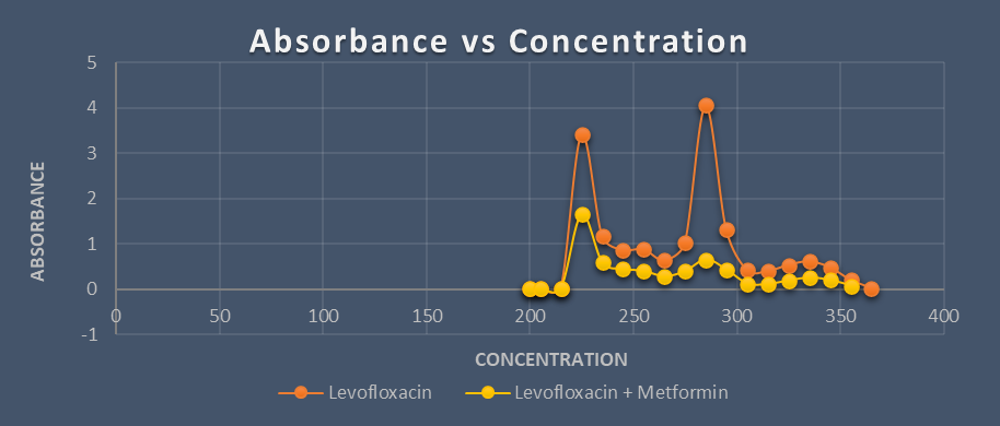 From the figure we can observe that the absorbance of Levofloxacin is different when it interacts with Metformin.