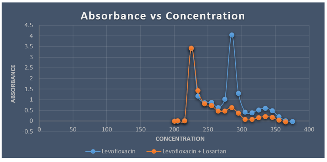| Wavelength (nm) | Absorbance of Levofloxacin | Absorbance of Levofloxacin + Losartan |