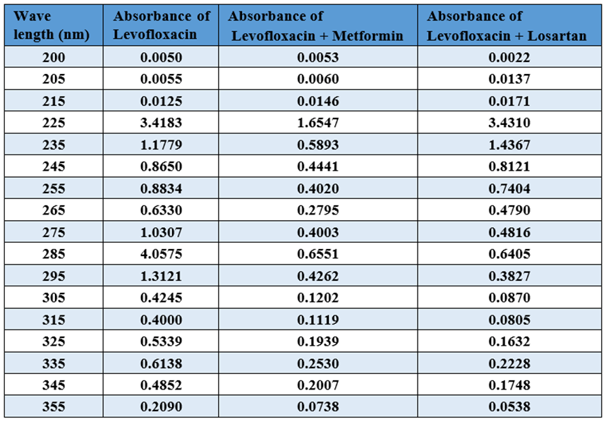| Wavelength (nm) | Absorbance of Levofloxacin | Absorbance of Levofloxacin + Metformin |