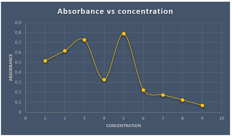 Levofloxacin stock solution at pH 7.4 and concentration of 1×10-4 M was added in different concentrations to ten test tubes, to have the following concentrations: 9×10-5 M, 8×10-5 M, 7×10-5 M, 6×10-5 M, 5×10-5 M, 4×10-5 M, 3×10-5 M, 2×10-5 M, 1×10-5 M.