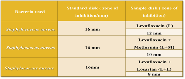 By antimicrobial investigation, it is observed that the zone of inhibition of the drug Levofloxacin with Metformin and Losartan is reduced from 12 mm, 10 mm and 8 mm respectively.