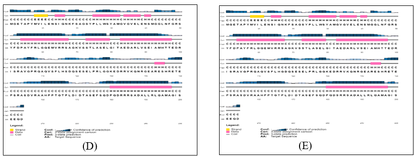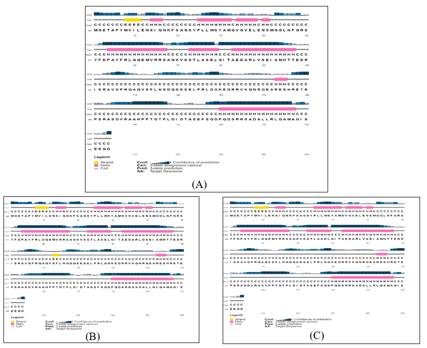 Figure 4: Secondary structure representation of all isolates and reference protein. (A), (B), (C), (
