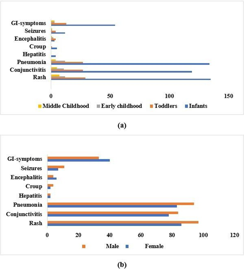 Regarding the association of symptoms with different age groups, most of the symptoms including conjunctivitis, hepatitis, croup, seizures, and gastrointestinal symptoms showed no significant difference ( p>0.05 ). However, except pneumonia (p = 0.000) and encephalitis (p = 0.014) were significantly different among different age groups. Further group-wise comparison revealed that pneumonia was significantly different between, Infants- Toddlers (p = 0.025), Infants-Middle childhood (p = 0.000), Toddlers-Middle Childhood (p = 0.015), Early Childhood-Middle Childhood (p = 0.016). Similarly, Encephalitis was significantly different between Infants- Toddlers (p = 0.005), and Infants-Early Childhood (p = 0.008). Lastly, the analysis of symptoms with respect to gender showed no significant differences (p>0.05), indicating that symptoms prevailed equally among both genders.