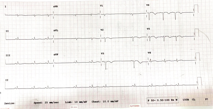 Figure 1: Electrocardiogram showing poor progression of ‘r’ waves in lead I and aVL, and q waves in lead V1-V5.