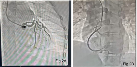 Figure 2: Coronary angiogram showing LMCA (left main coronary artery) aneurysm (black arrow) and stenoses of left anterior descending (LAD) and left circumflex artery (white arrows, Fig 2A). Normal right coronary artery (RCA, Fig 2B).