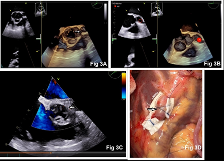 Figure 3: Intraoperative 3-D transesophageal echocardiography showing aneurysmal LMCA arising from the left aortic sinus (arrow and red circle 3A, 3B). Closed communication between aortic sinus and LMCA after its ligation (3C). Surgical photograph showing ligation of aneurysmal LAD artery (black arrow) and vein graft anastomosed to distal LAD (white arrow).