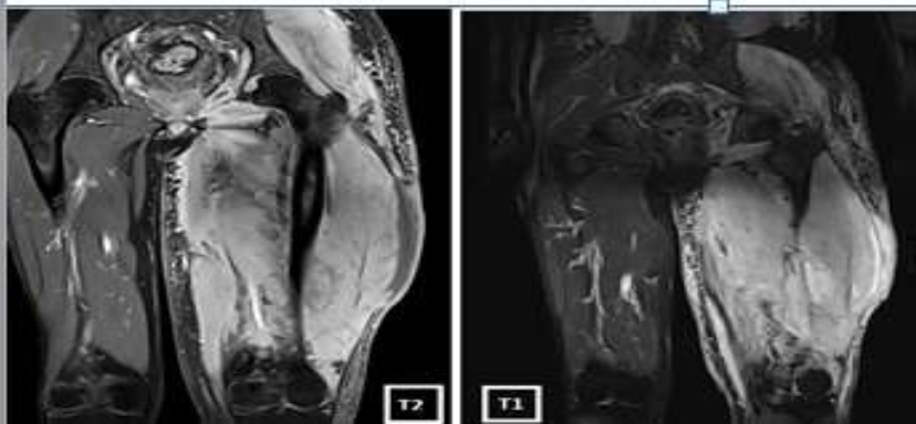 Figure 2a: Pelvic MRI showing altered signal intensity in the left thigh muscles