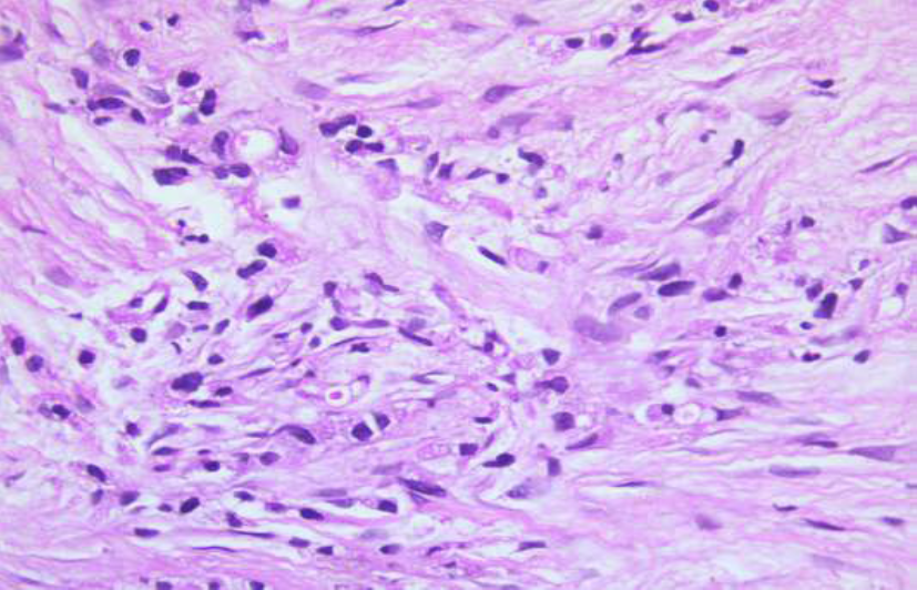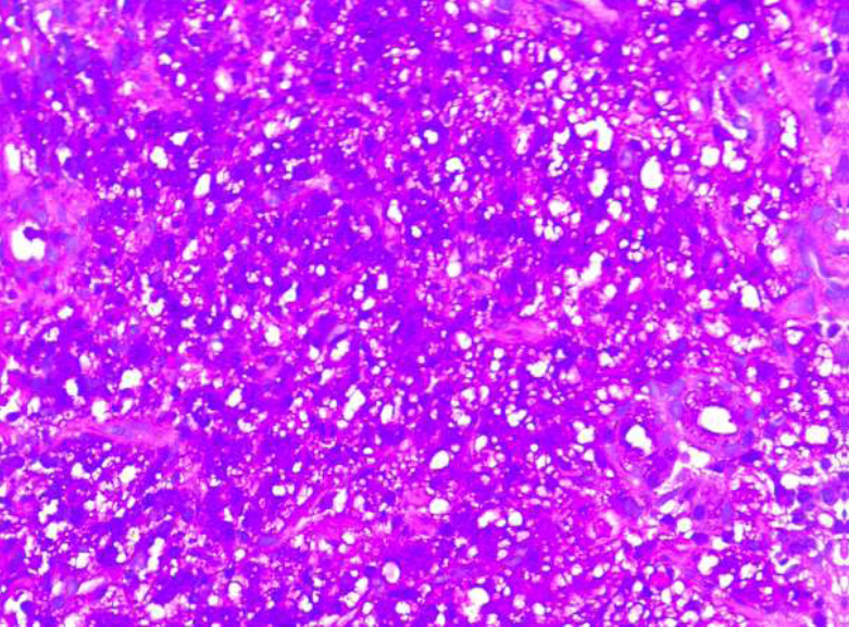 Figure 3a: Photomicrographs of trucut biopsy thigh mass showing nest of tumor cells with vacuolated cytoplasm (Hematoxylin & eosin x 400)