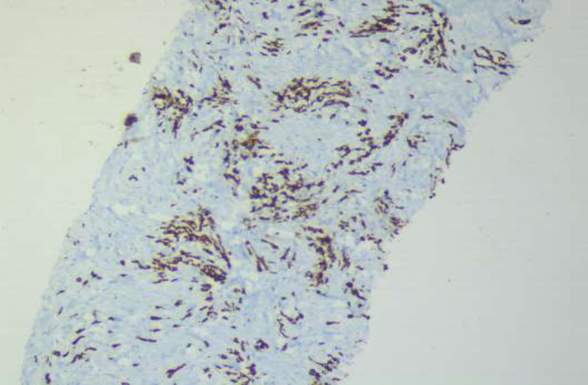 Figure 3 b: Immunohistochemistry for cytokeratin 7 highlighting the nests of tumor cell in the biopsy of thigh mass (x90)