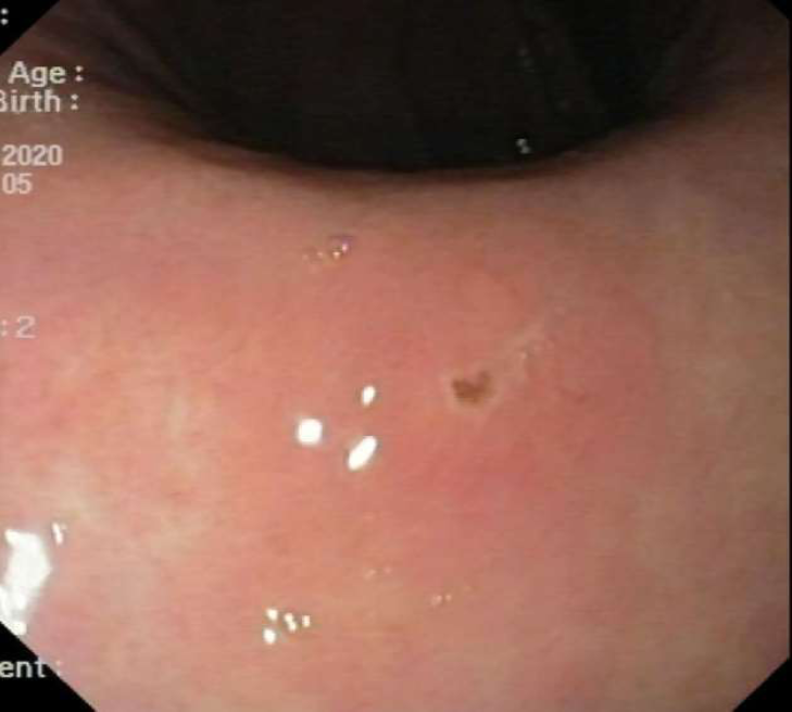 Figure 4a: Gastroscopy showing an ulceration of the incisura of the stomach with irregular margins.