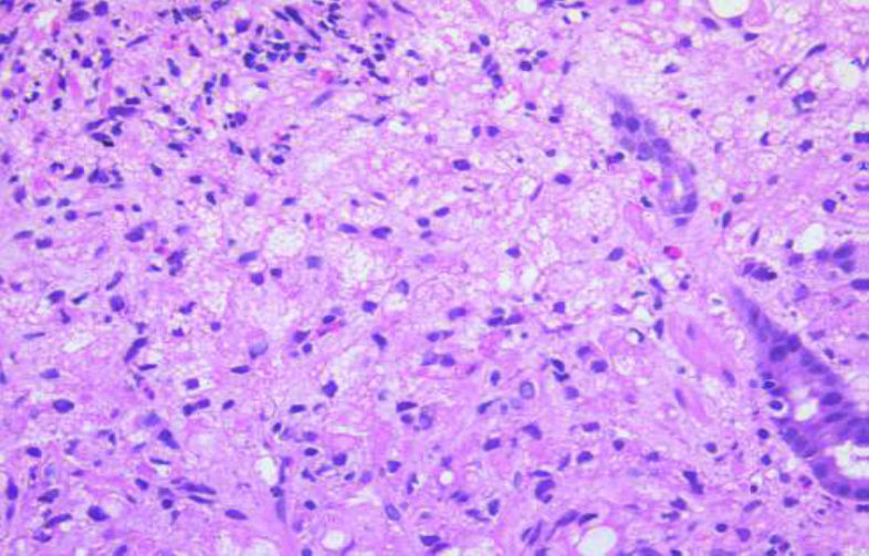 Figure 4b: Gastric mucosal biopsy with infiltrates of tumor cells with vacuolated cytoplasm (Hematoxylin & eosin x400)