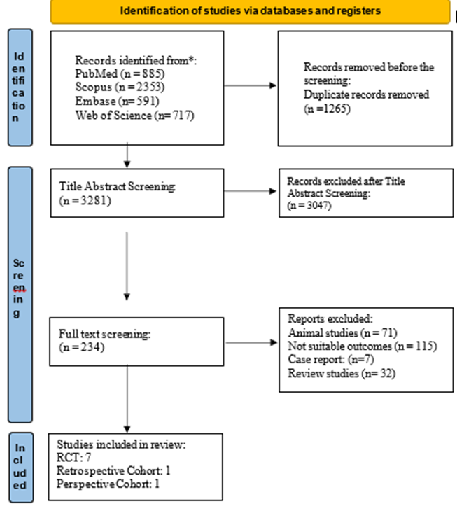 Duplicate records were removed using EndNote, and the remaining unique articles were imported into Rayyan for title and abstract screening by two independent reviewers. Full texts of potentially eligible studies were then retrieved and assessed according to the inclusion and exclusion criteria. Discrepancies at any stage were resolved by consensus or, if necessary, by consultation with a third reviewer. The study selection process is illustrated in the PRISMA flow diagram (Figure 1).