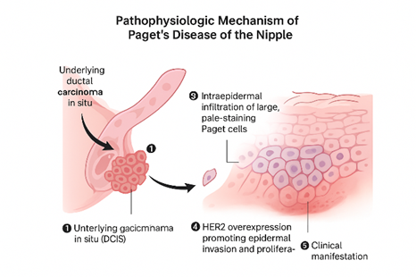 Histopathologically, the condition is marked by the presence of large, pale-staining Paget cells containing mucin and cytokeratin 7 within the epidermis. The underlying pathology frequently corresponds with ductal carcinoma in situ (DCIS) or invasive ductal carcinoma. Advances in molecular diagnostics, including immunohistochemistry and HER2/neu expression profiling, have improved diagnostic accuracy and therapeutic planning. Clinically, patients present with persistent erythema, nipple scaling, burning, or discharge, which may be mistaken for inflammatory disorders.
