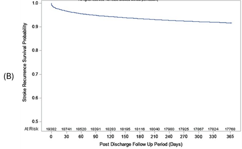 Only 3.3% of the linked population had a recurrent stroke event (defined as a hospital readmission with a primary discharge diagnosis of stroke) within 30 days; this increased to 5.1% at 90 days and to8.3% at one year (Table 2 and Figure 1B).