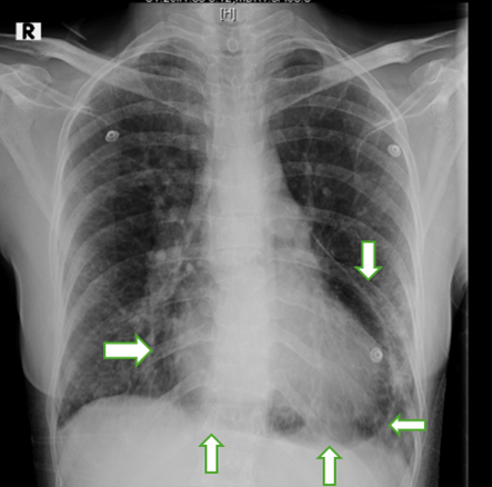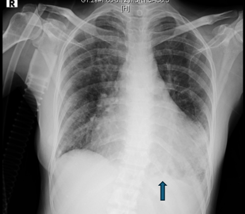 Figure 3: Chest radiograph showing a lucency around the cardiac silhouette with ‘continuous diaphragm sign' (white arrow)