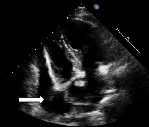 Figure 2: Transthoracic echo showing pericardial effusion. (white arrow)