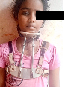In this case, report we used Four post collar for an 11-year-old young lady with post burns contracture involving her face and neck. We used four-post collar in this patient 3 months after the burns. The contracture band started to occur in the neck post burns. Before using it, three neck measurements were taken from the angle of the mandible to the clavicle on both sides (A and B) and from the chin to the sternal notch (C). The measurements are A- 8 cm, B- 9 cm, C- 11 cm.