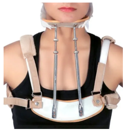 Four post collar is made of malleable aluminium anterior and posterior support with proper ethafoam padding. Front and back have two adjustable rods with anterior chin supports & posterior occipital support which ensures perfect cervical immobilization. There are two shoulders and two auxiliaries adjustable –Hook loop decline straps which enhance proper fitting. Adjustable all four rods allow surgeons to give proper distraction to the cervical spine