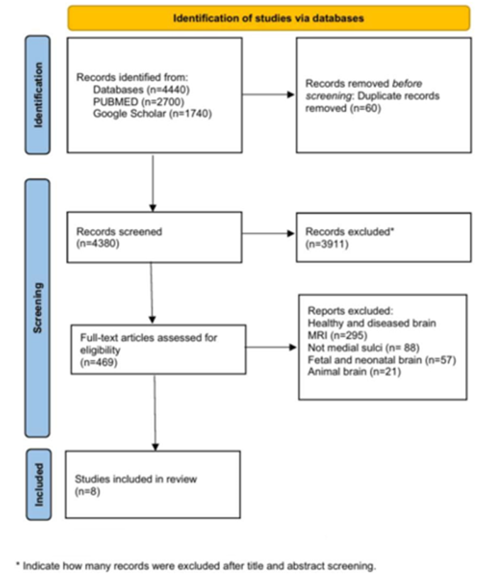 A total of 4,440 records were retrieved, of which 60 duplicates were removed. After title and abstract screening, 3,911 records were excluded. Full-text review was performed for 469 articles, resulting in the exclusion of 461 papers for reasons including non-cadaveric methodology, pediatric or pathological specimens, non-medial sulci, and lack of full text. Ultimately, eight cadaveric studies met inclusion criteria, collectively examining 422 hemispheres. The study selection process is summarized in Figure 1.