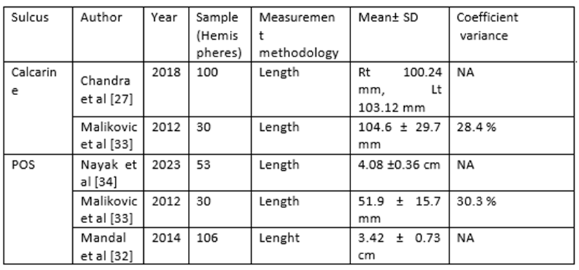 visual cortical mapping. POS consistently connects with the calcarine sulcus at a junction known as the cuneal point, serving as a reliable anatomical landmark for mapping visual cortical areas. While its length varies slightly between hemispheres, type 3 tends to be the longest, and type 1 was the shortest [34]. Table :2 provides detailed summary of morphologicalevidences.