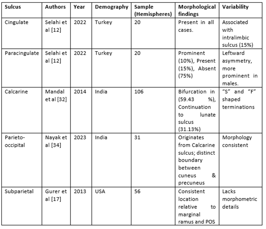 The included studies analyzed a total of 422 hemispheres from formalin-fixed cadaveric brains. The cingulate sulcus was consistently present in all examined specimens, whereas the paracingulate sulcus displayed marked variability. The calcarine sulcus demonstrated relatively stable morphometry, with mean anterior and posterior segment lengths ranging from 2.3 to 3.5 cm, yet exhibited variable bifurcation patterns and lunate sulcus connections. The parieto- occipital sulcus was a reliable boundary between the cuneus and precuneus, with mean lengths around 4.0 cm. The subparietal sulcus was described less frequently, highlighting a gap in detailed morphometric literature.