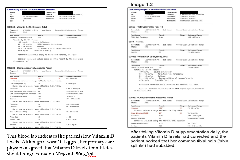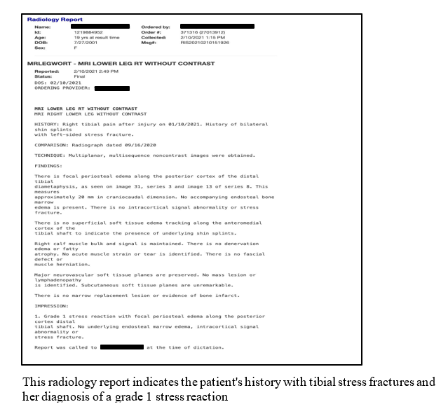 Case: A 19-year-old competitive female triathlete with a 6-month history of amenorrhea, stress fractures, disordered eating, and anxiety presents to her primary care physician for progressive fatigue. Her fatigue began 6 months ago, after beginning her competitive season for triathlon. She had been previously seen by healthcare professionals, but her concerns were dismissed as she was told that her fatigue was due to being a full-time student athlete. 3 months into her season, she noted consecutively missed menstrual cycles. She began having anterior tibial pain that she presumed was from a difficult training regime. Upon further examination her PCP ordered a CBC, BMP, TSH, and Vitamin D levels. Studies revealed all to be normal besides a low Vitamin D count. Further testing was done to rule out causes of her amenorrhea such as: beta-hcg, ovary function test, and prolactin tests which were all unrevealing. MRIs were taken to assess her recurring shin pain, with impressions of a grade 1 stress fracture and history of previous stress fractures. Discussion of the patient's prior eating habits revealed a history of bulimia nervosa. Patient was started on Vitamin D supplementation (30 mcg once per day), an increased caloric intake, and supplemental counseling appointments to address her eating disorder. Attached are blood labs, and a radiology report that are used for reference.