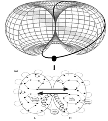 Figure 4: This figure represents how the psychions are embodied, as psychons, from the consciousness field (CF) in the neurons of brains (figure a, adopted from McFadden, 2020, represents the human brain—left (L) and right (R) hemispheres—and its EM field, which holds together and integrates the qualia of psychions, informational content of the superverse/multiverses, which becomes individuated consciousness recursively organized and reproduced as practical consciousness), which produces an EM field that holds together and integrates the qualia of the psychions as individuated consciousness on channels or stations of frequency wavelengths from the absolute vacuum. For Mocombe, building on BHBBT, the superverses with entangled and superimposed (via black holes) multiverses share the same informational content. So, the hypothesis here is that one superverse created (from the absolute vacuum) a universe, and its informational content is entangled and superimposed on top of another superverse with the informational content of the previous universe emerging in it via black holes. Hence what you have are a layer of multiverses and superverses, superimposed and entangled, whose informational contents are shared or recycled via black holes, which organize and structure the multiverses similarly. As such, quantum fluctuation and big bangs are constantly occurring and producing the same worlds, ad infinitum. The informational content, qualia, of these multiverses and worlds are encoded and transmitted as psychions (channel frequency of wavelengths) and embodied in the neurons of brains, which create an EM field that holds and integrates the psychions as individuated consciousness.